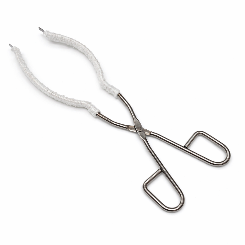 A: It’s a lab tool used to hold and move hot beakers, flasks, or similar glassware safely without touching them directly, reducing risk of burns or accidents.